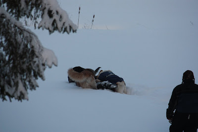 Kl. 04.05 blev jag "kissnödig". Matte vägrade gå upp. Efter att ha pussat matte alldeles hysteriskt (samt krafsat på dörrn och fört oväsen), så fick jag upp matte 05.10. Och var jag kissnödig? NEJ! Det är ett gammalt knep det där som matte fortfarande går på! Jag ville bara strosa runt i snön (som når upp till min mage). Man måste ju kolla saker och ting då och då på tomten. Vem vet, det kanske hade varit någon och snott en vattenhink under natten.